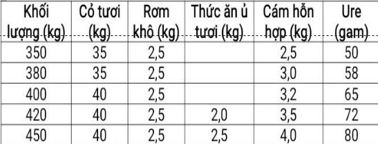 - Khoáng đa lượng, vitamin: Ure, Vitamin A, D, khoáng đa lượng như Ca, P, Na... thường bổ sung dưới dạng premix vitamin, premix khoáng 1-2% trong khẩu phần thức ăn tinh cho bò.