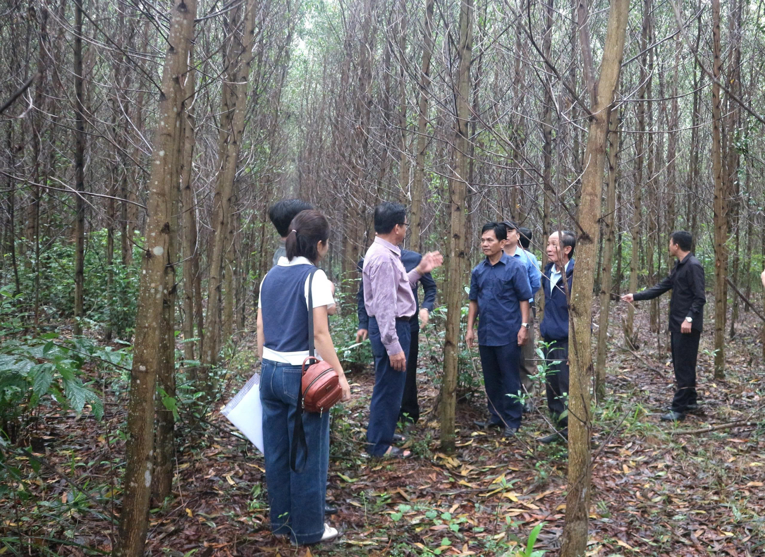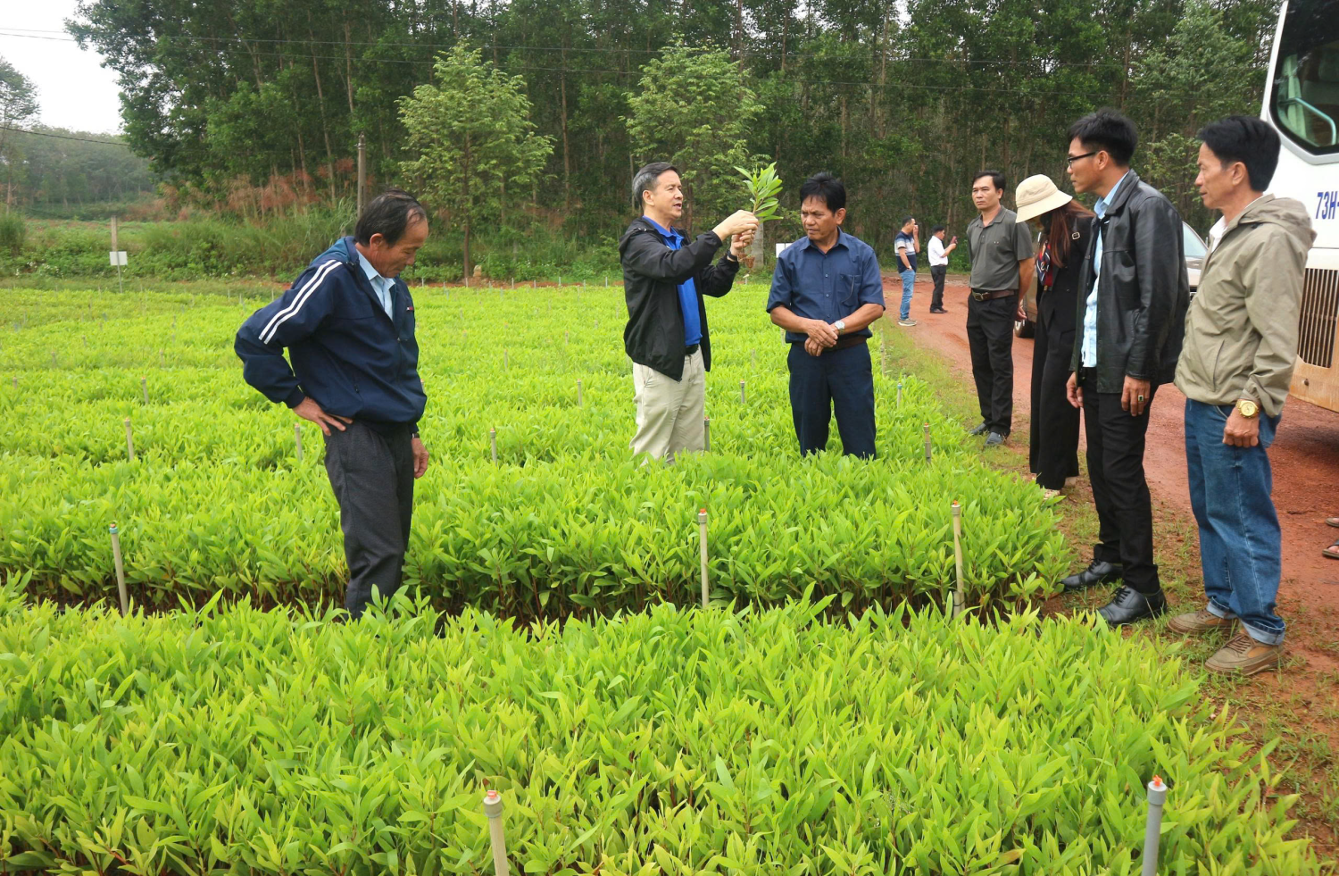 Tại các điểm tham quan, học viên được nghe giới thiệu tổng quan về quy trình sản xuất, quản lý và chăm sóc rừng gỗ lớn, cũng như trao đổi kinh nghiệm thực tế với các chủ rừng, hợp tác xã và đơn vị ươm giống. Nhiều nội dung thiết thực được chia sẻ như: lựa chọn giống keo lai mô và keo tai tượng chất lượng cao, kỹ thuật trồng thâm canh, phòng trừ sâu bệnh, tỉa thưa – bón phân hợp lý, và biện pháp nâng cao năng suất, chất lượng gỗ.
